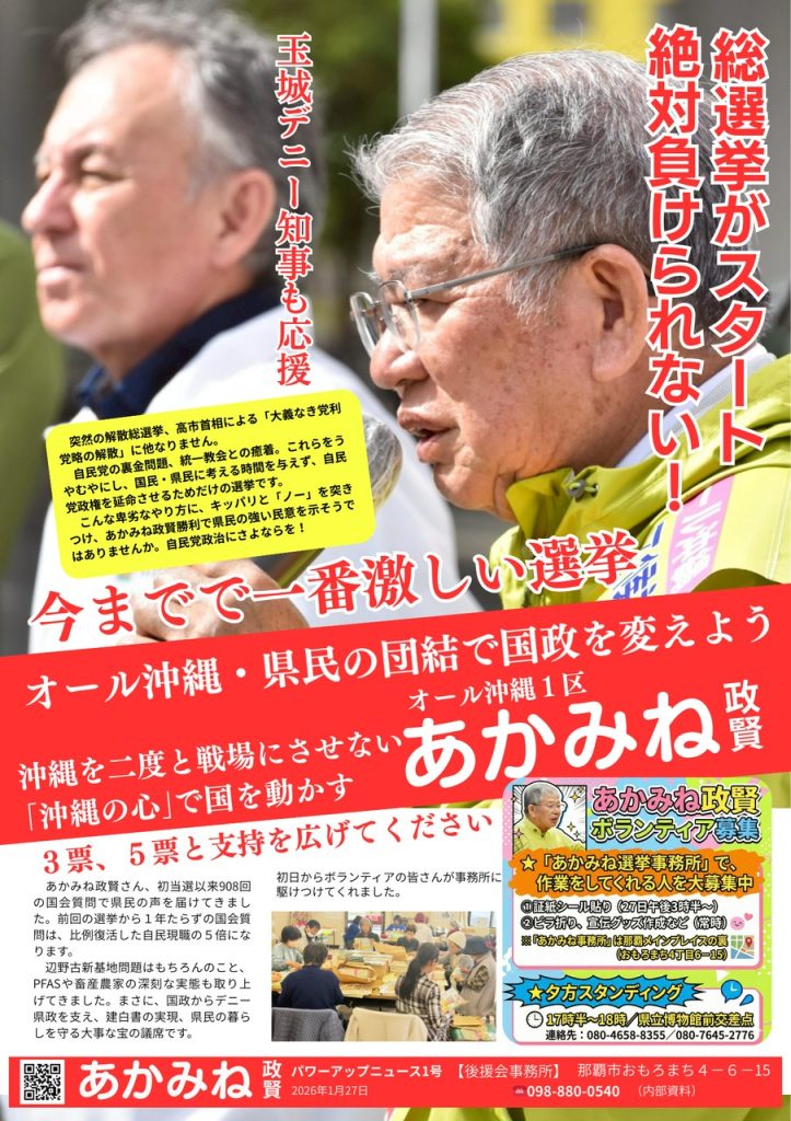 2026.01.28 今までで一番激しい選挙 物価高、裏金、統一協会、基地問題。 国民の声を踏みにじる政治を、ここで止める。 玉城デニー知事も応援。オール沖縄の団結で国政を変えよう。 沖縄を二度と戦場にさせない。あかみね政賢を国会へ。 3票・5票と支持を広げてください拡散お願いします