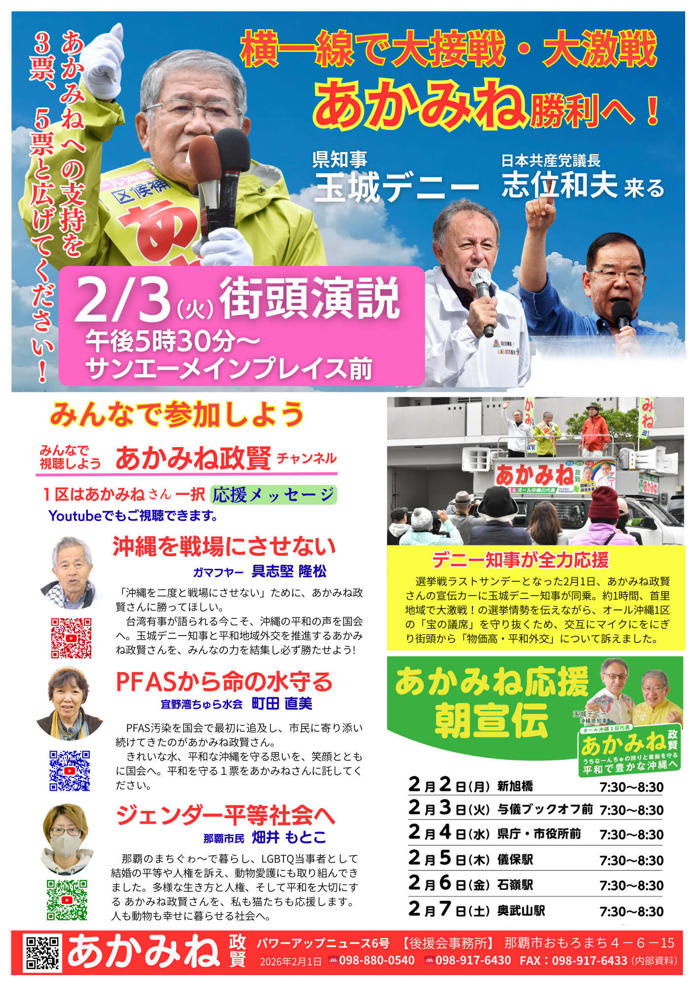 2026.02.02 横一線の大接戦。勝敗は一票一票にかかっています。 平和を守り、暮らしを守り、命を守る政治を、いま沖縄から。 25年、全力で新基地建設に反対してきたあかみね政賢を、どうか押し上げてください。 あなたの一票、三票、五票が、未来を変えます。