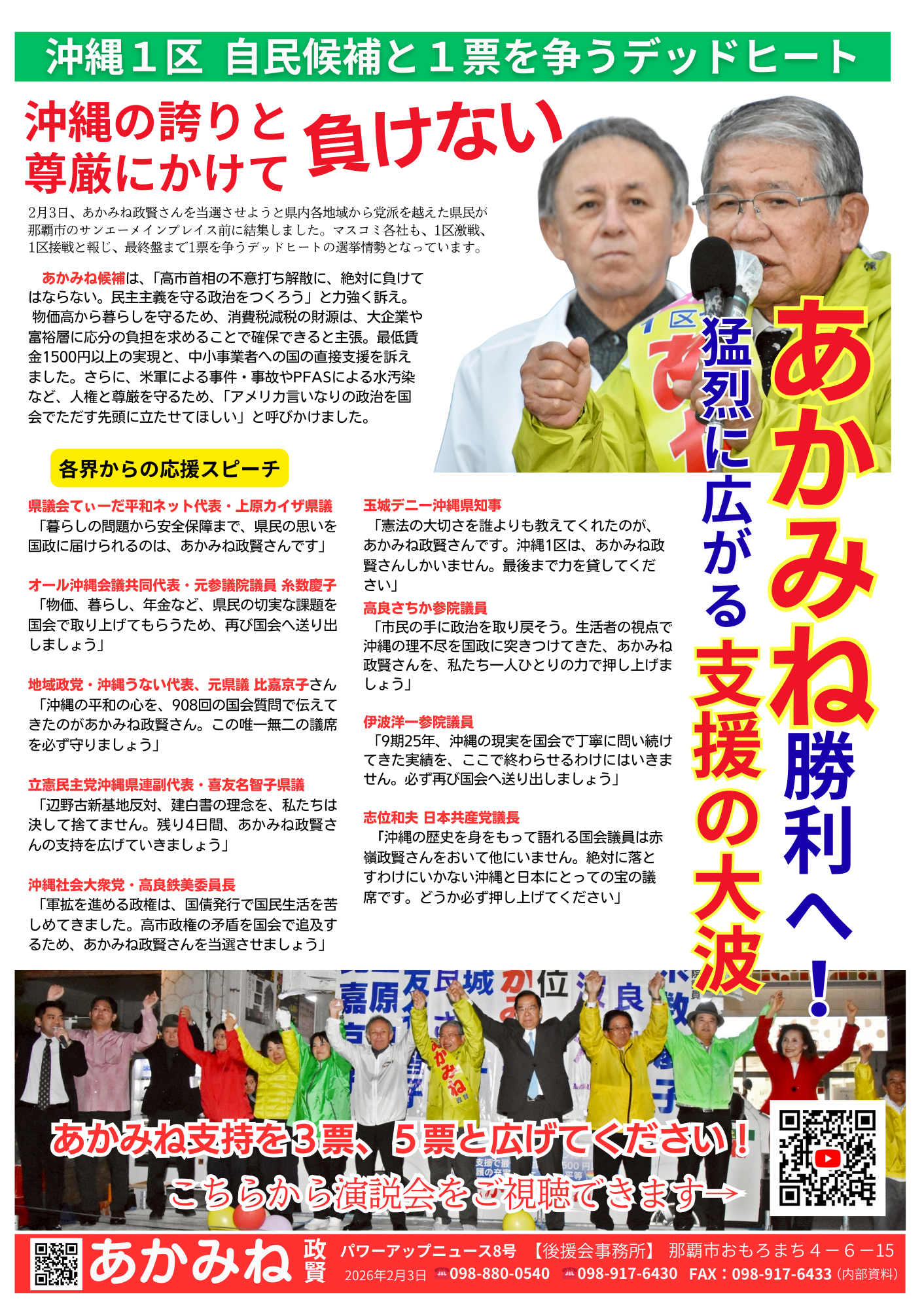 沖縄1区は、最後まで一票を争う大激戦。 誇りと尊厳をかけた、負けられない闘いです。